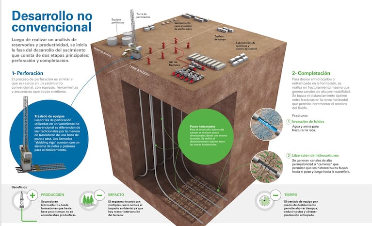 Hace años se sabe que allí hay petróleo y gas, pero no se conocía la tecnología que permitiera extraerlo. El hidrocarburo convencional encuentra “cavernas” dentro de la roca y allí se acumula: la extracción consiste en perforar y sacarlo con bombas. En Vaca Muerta, el petróleo está “embebido” en la roca y para extraerlo hay que fracturar la roca. Eso proceso es mucho más costoso y se llama “fracking”, porque se utiliza una tecnología no convencional.