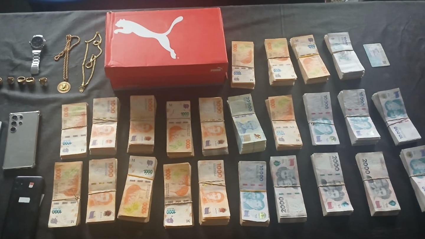 En el interior del vehículo, los agentes encontraron una caja de zapatillas con más de $8,5 millones en efectivo, además de alhajas, celulares y otros elementos de valor cuya procedencia los ocupantes no pudieron justificar.