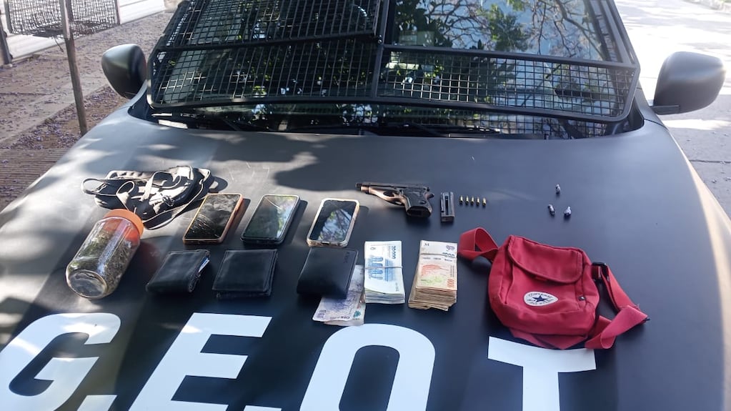 Durante el control, los agentes hallaron en el interior del vehículo un frasco con marihuana, una pistola calibre 22 con cinco cartuchos, tres teléfonos celulares y una suma de dinero en efectivo cuya procedencia se investiga.