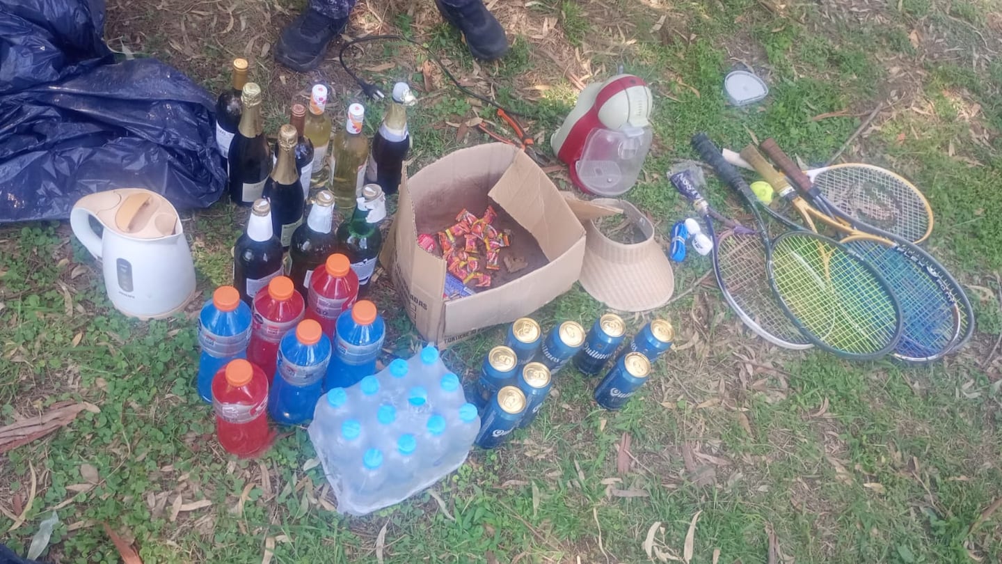 Durante el operativo, los efectivos recuperaron cinco raquetas, diez pelotas de tenis, diez botellas de bebidas alcohólicas, golosinas varias, una cafetera y una pava eléctrica.