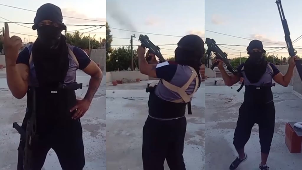 Con la cara tapada con una remera, al estilo piquetero, y con una camiseta de entrenamiento de Talleres, el criminal aparece fuertemente armado con un subfusil de 9 milímetros y una escopeta, al tiempo que amenazaba a un rival.