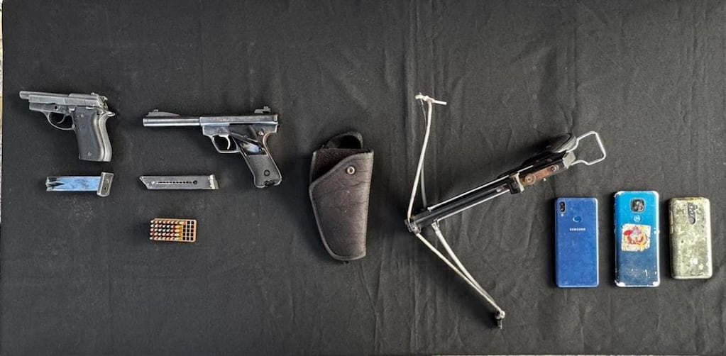 Durante los allanamientos se secuestraron dos pistolas calibre 9 mm y 22 mm (ambas con cargador), 36 cartuchos, una ballesta de aluminio Crossbow de 45 libras, dos réplicas de pistola calibre 9 mm, una balanza de precisión, siete envoltorios de clorhidrato de cocaína, cinco teléfonos celulares y dinero en efectivo, entre otros elementos de interés para la causa.