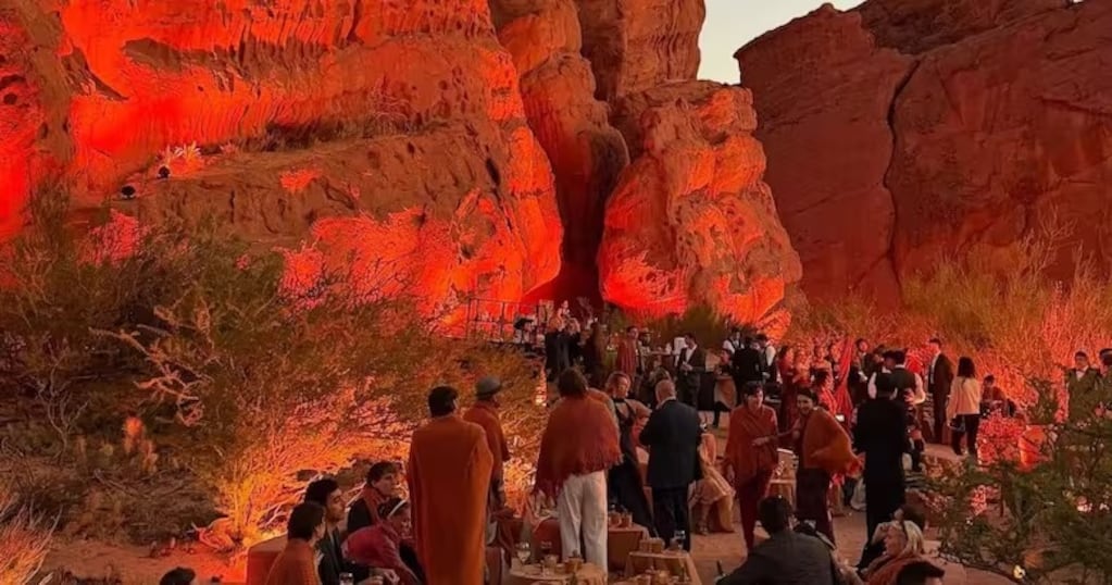 La celebración tuvo lugar en el paraje La Punilla, dentro de la Quebrada de las Conchas, un área protegida por ley provincial. Las imágenes muestran una fiesta con estética cuidada, iluminación especial, barras de tragos y sectores ambientados con sillones, velas y detalles decorativos.
