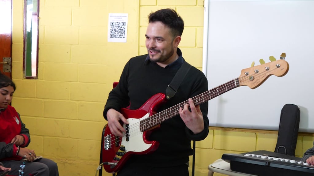El docente lleva 15 años en la institución y contó que la escuela se fue equipando de a poco para acompañar esta propuesta artística.“Se fue comprando un instrumento por año. Tenemos 6 teclados, 6 guitarras, ukeleles, una batería, bombo, bongó, guiros”, detalló.