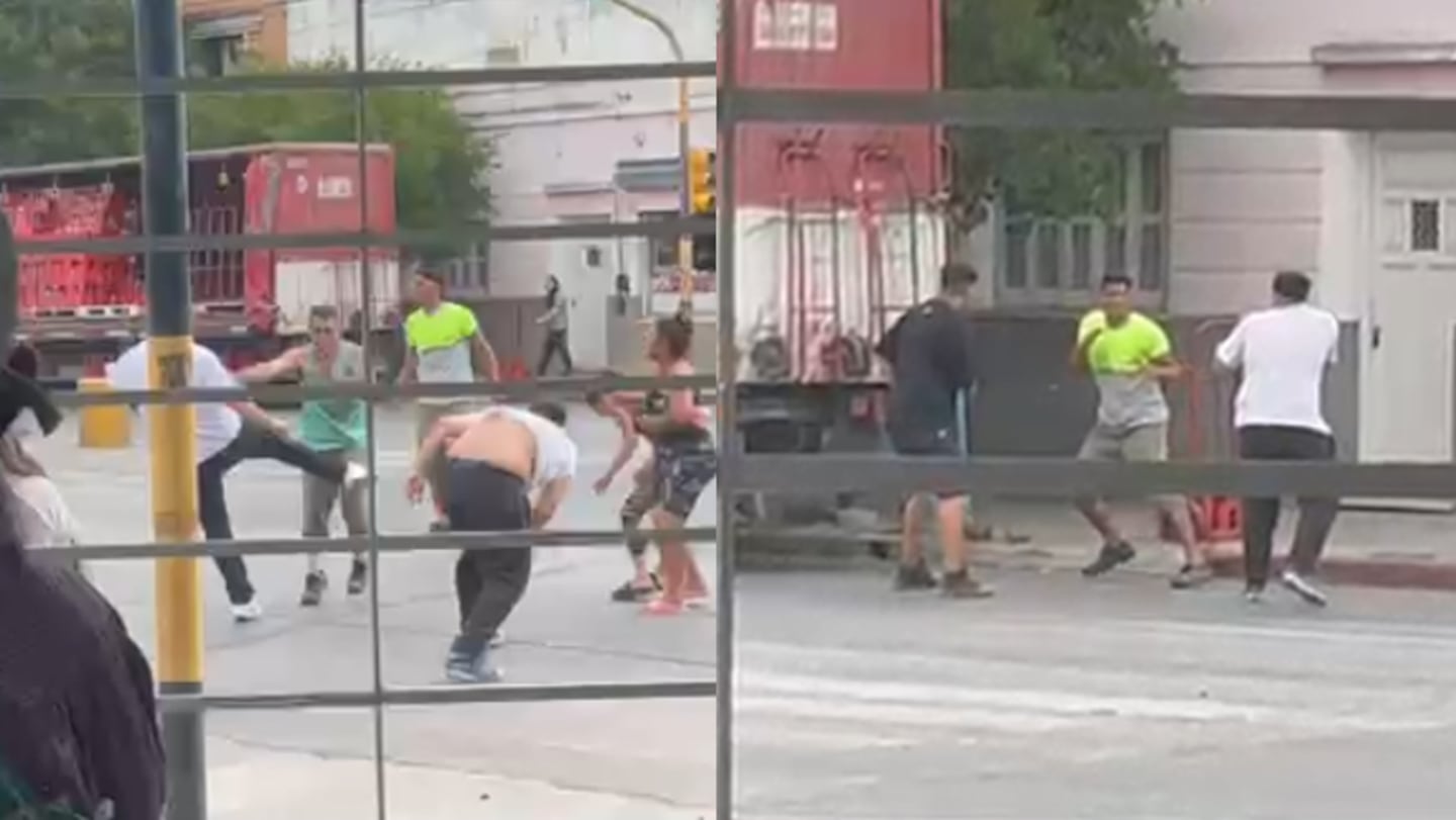 En las imágenes del video se ve a tres trabajadores de la reconocida marca de gasesosa combatiendo a puño limpio contra hombres, adolescentes, mujeres y niños, mientras la gente que pasaba se refugiaba en los locales aledaños.