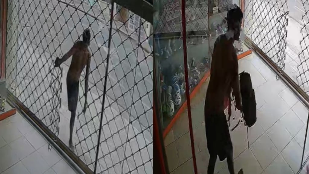 Un robo en un comercio de barrio San Vicente quedó registrado por la cámara de seguridad del lugar. En las imágenes se ve a un hombre descalzo y en cuero que rompió una vidriera y se llevó tres mochilas.