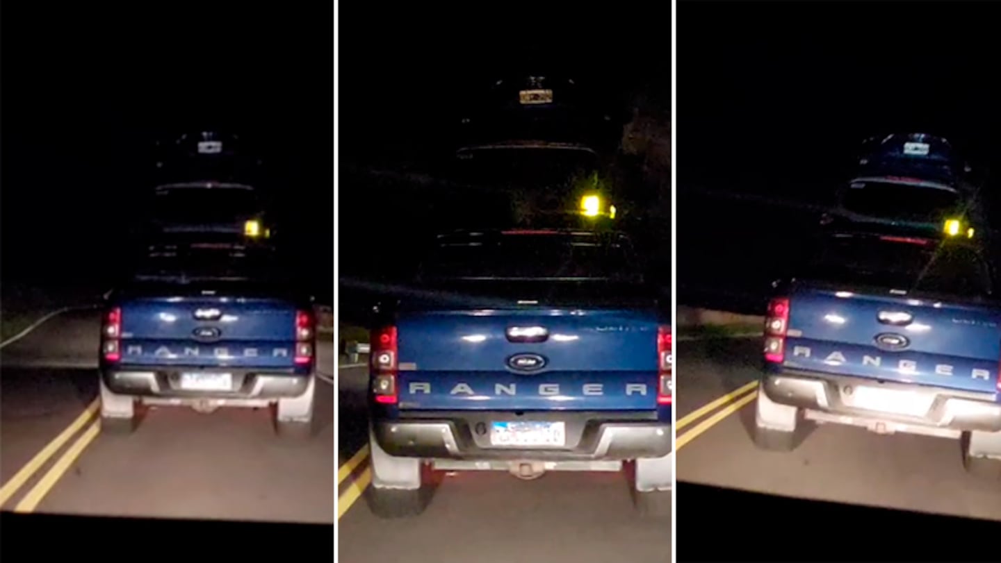 La situación fue registrada en video por otros automovilistas que viajaban por la zona y lo compartieron con ElDoce.tv. En las imágenes, la acompañante de un auto no pudo ocultar su asombro. “No puede ser eso: un camión que lleva autos y lleva una camioneta enganchada y la única luz es eso que se ve ahí arriba que se está apagando”, relató mientras filmaba la peligrosa maniobra.