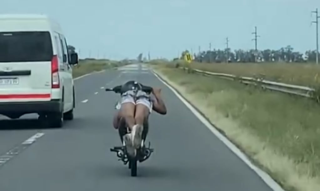 En el registro se observa al motociclista acostado sobre el asiento, manejando con una sola mano, mientras avanza a velocidad por la calzada. En ese momento, un utilitario que venía por la misma vía tuvo que esquivarlo para evitar un accidente.