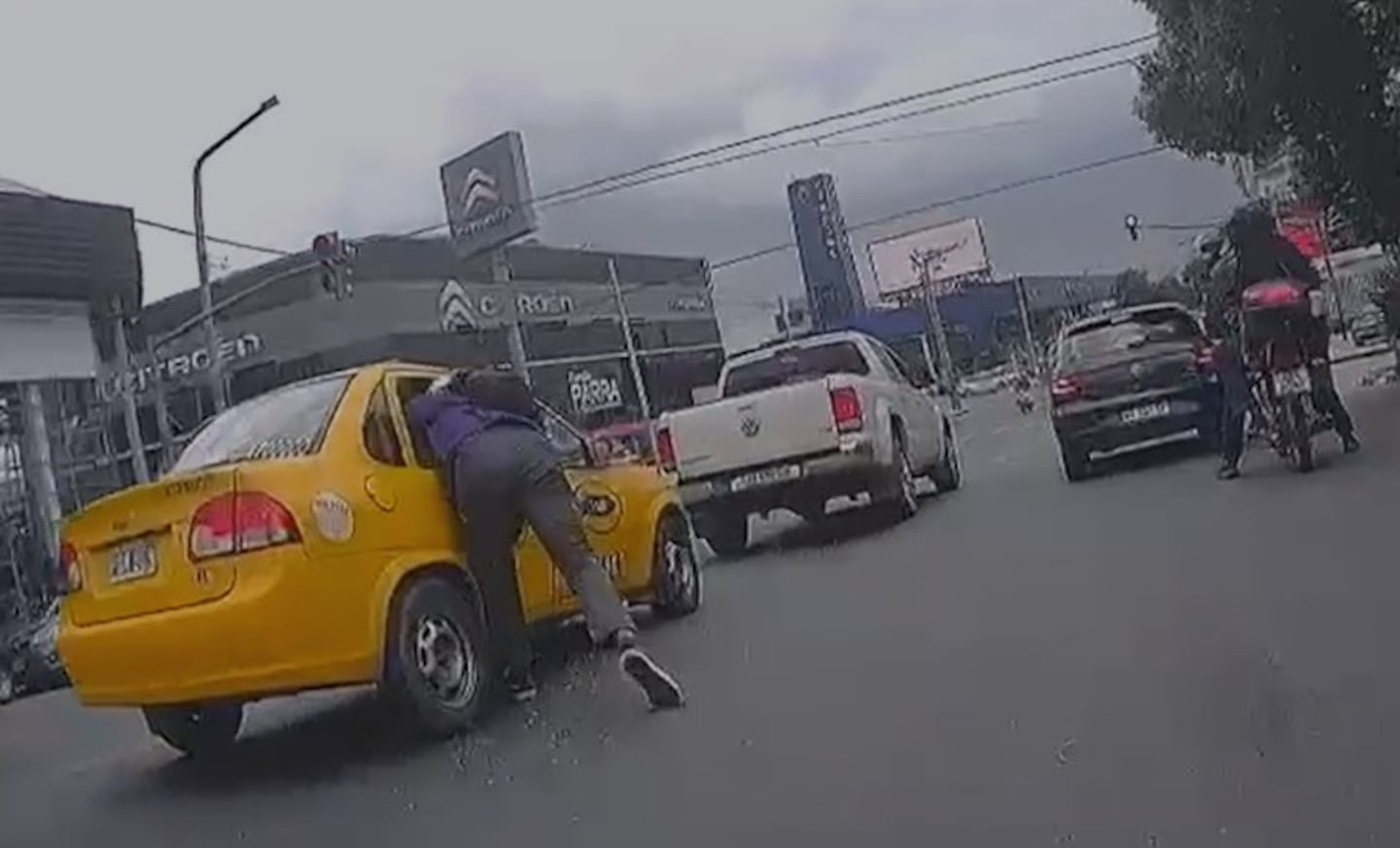 En medio de un breve forcejeo, no logró concretar el robo. Detrás del taxi circulaba otra motocicleta que terminó embistiendo al asaltante para frustrar el ataque. A pesar de eso, los ladrones escaparon en contramano.