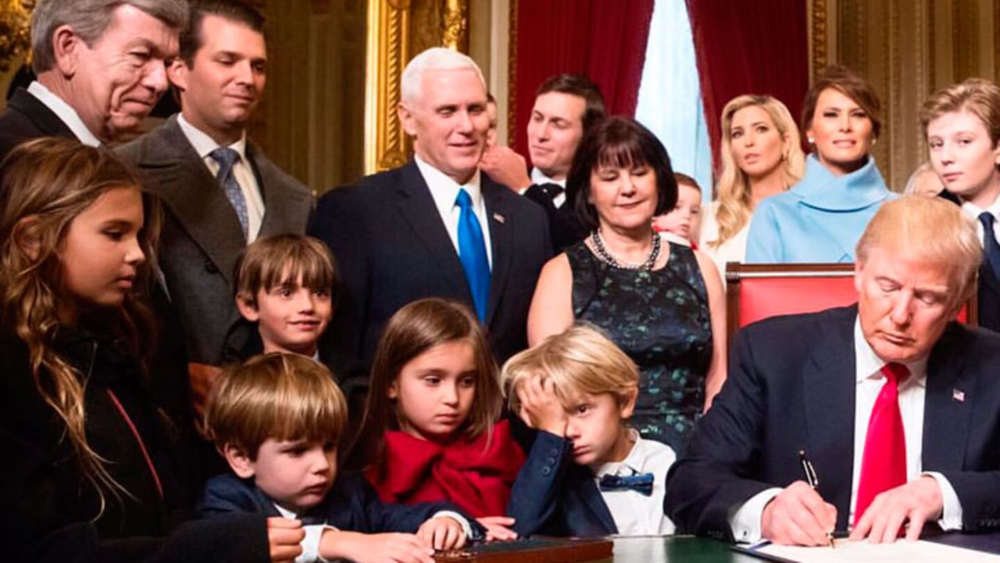 Ivanka Trump y su marido Jared Kushner, asesor del presidente, aparecen con sus dos hijos en sillitas de seguridad y con un videojuego en sus manos.