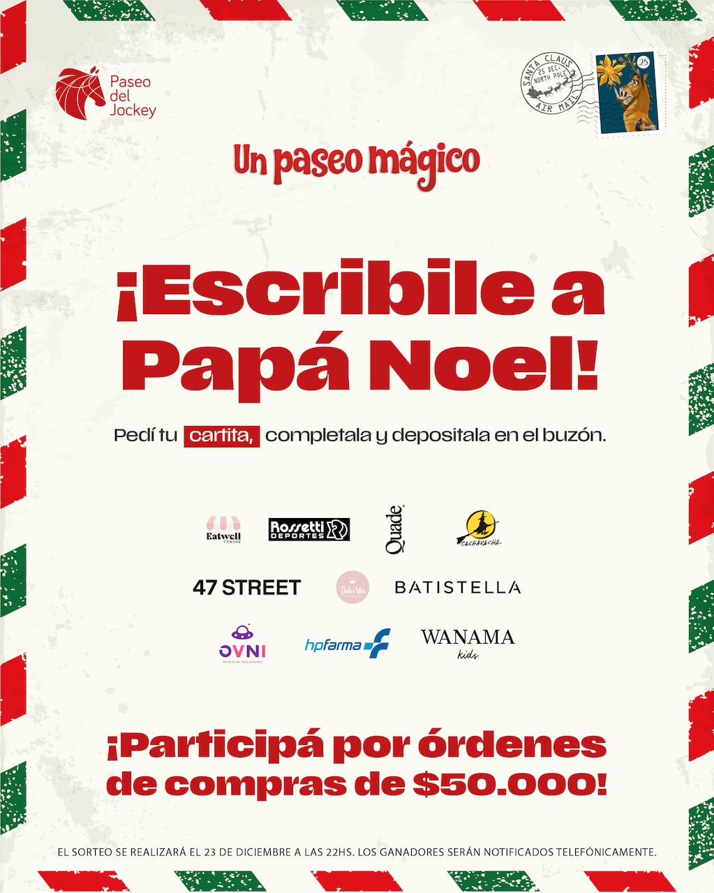 También, desde el viernes 12, en el stand de informes y en los comercios adheridos del Paseo hay disponibles cartitas impresas para enviar a Papá Noel.Cada niño puede completar la suya y dejarla en el buzón del hall central para participar por el sorteo de órdenes de compra de $50.000 cada una.