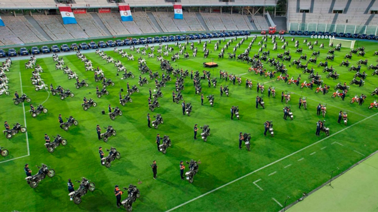 La Provincia presentó 400 camionetas y 600 motos adquiridas recientemente para la Policía de Córdoba. Las unidades fueron exhibidas en el estadio Mario Kempes en un acto encabezado por el gobernador Martín Llaryora, quien advirtió por la difícil situación económica.