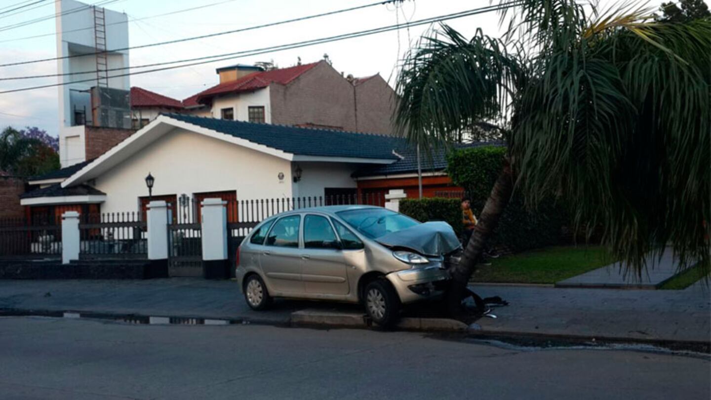 El auto chocó un canasto de basura, subió a la vereda, rozó la reja de una casa y terminó frenado por una palmera.