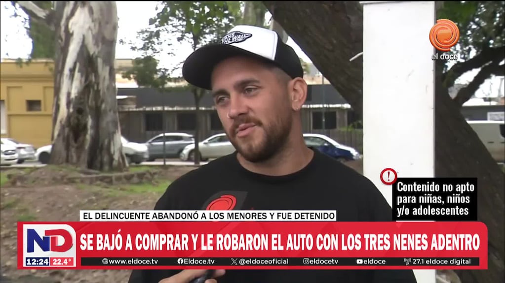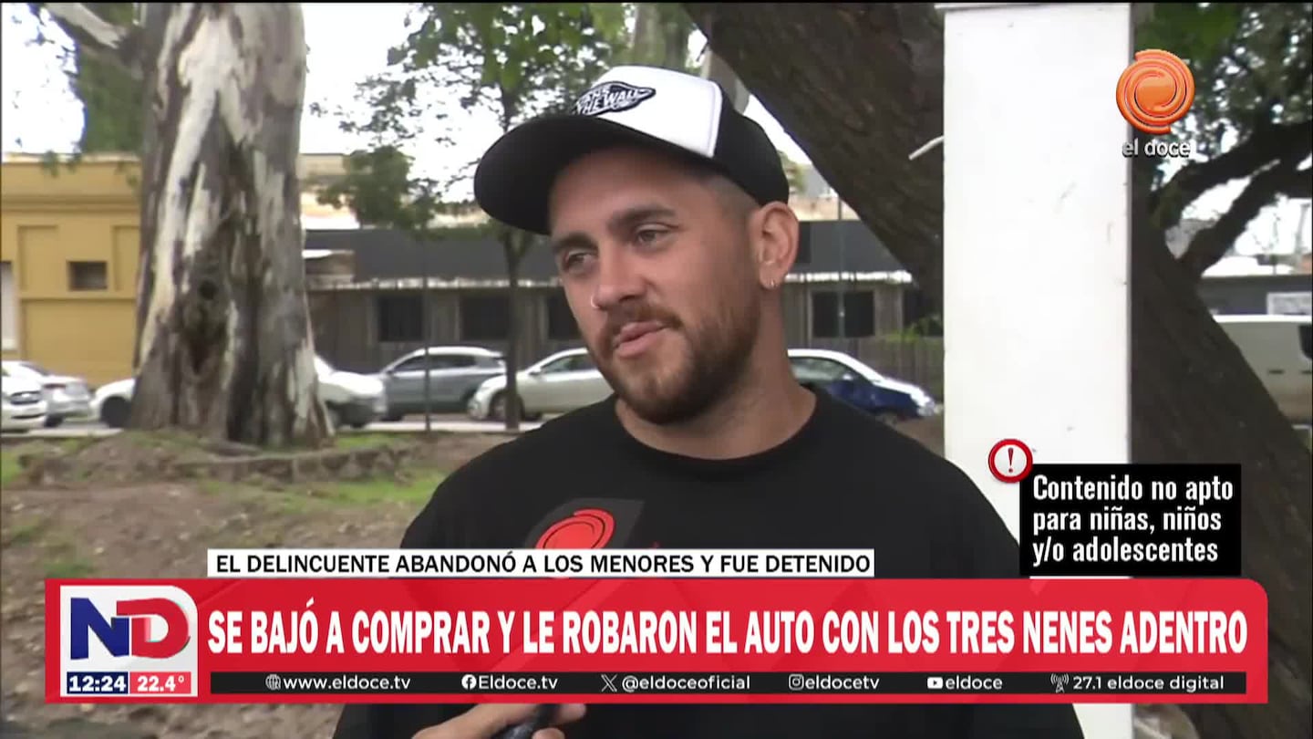 Theo, de 10 años, y sus hermanas mellizas de 7 quedaron en la Kangoo cuando el delincuente se la robó. “Me dijo ‘perdón papi’ como pidiendo perdón porque tenía que robar”, relató en Noticiero Doce.