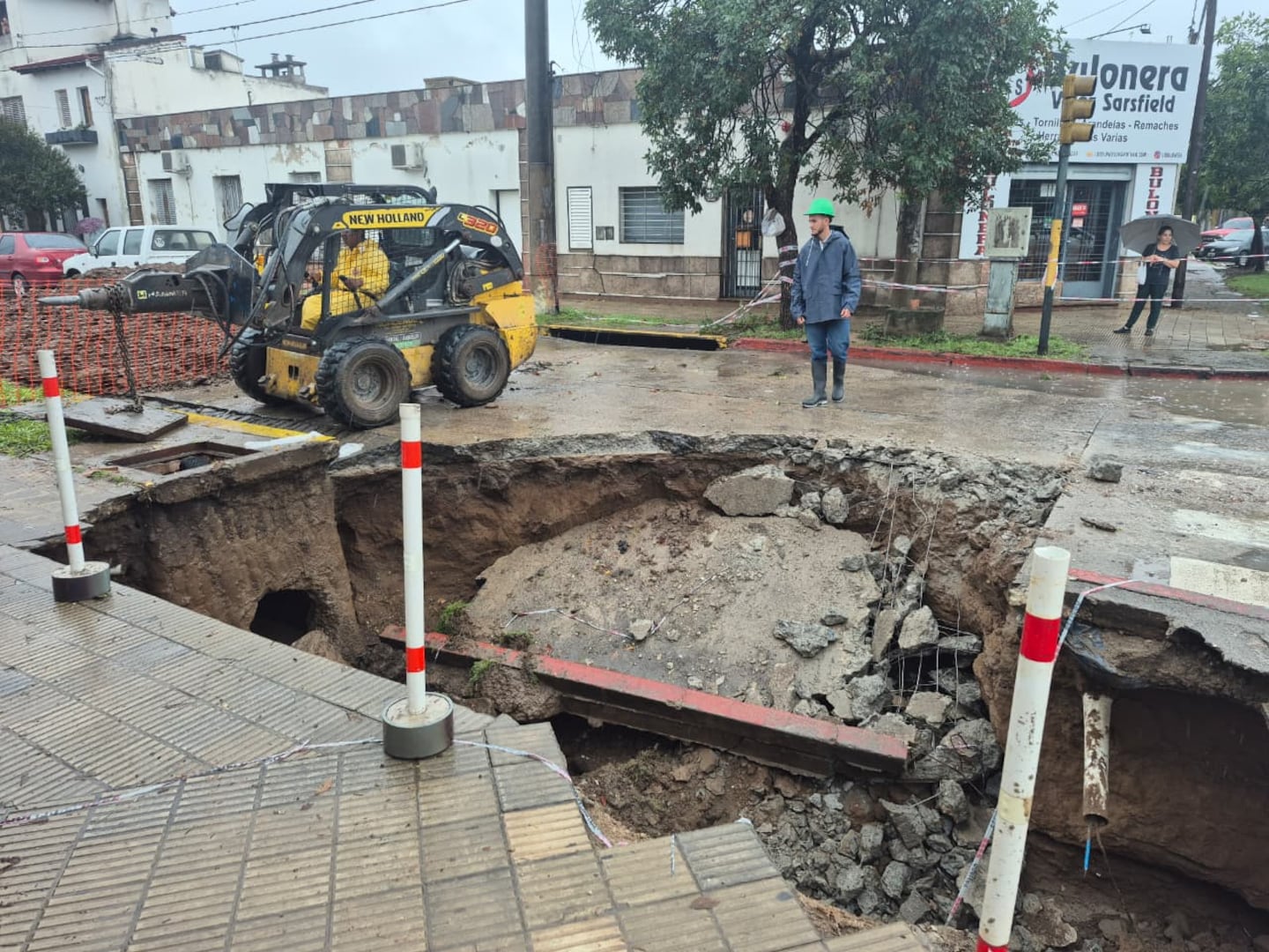 El pozo provocó destrozos en la calle y la vereda. Trabajan la Municipalidad y Aguas Cordobesas. No hay interrupción del servicio de agua.