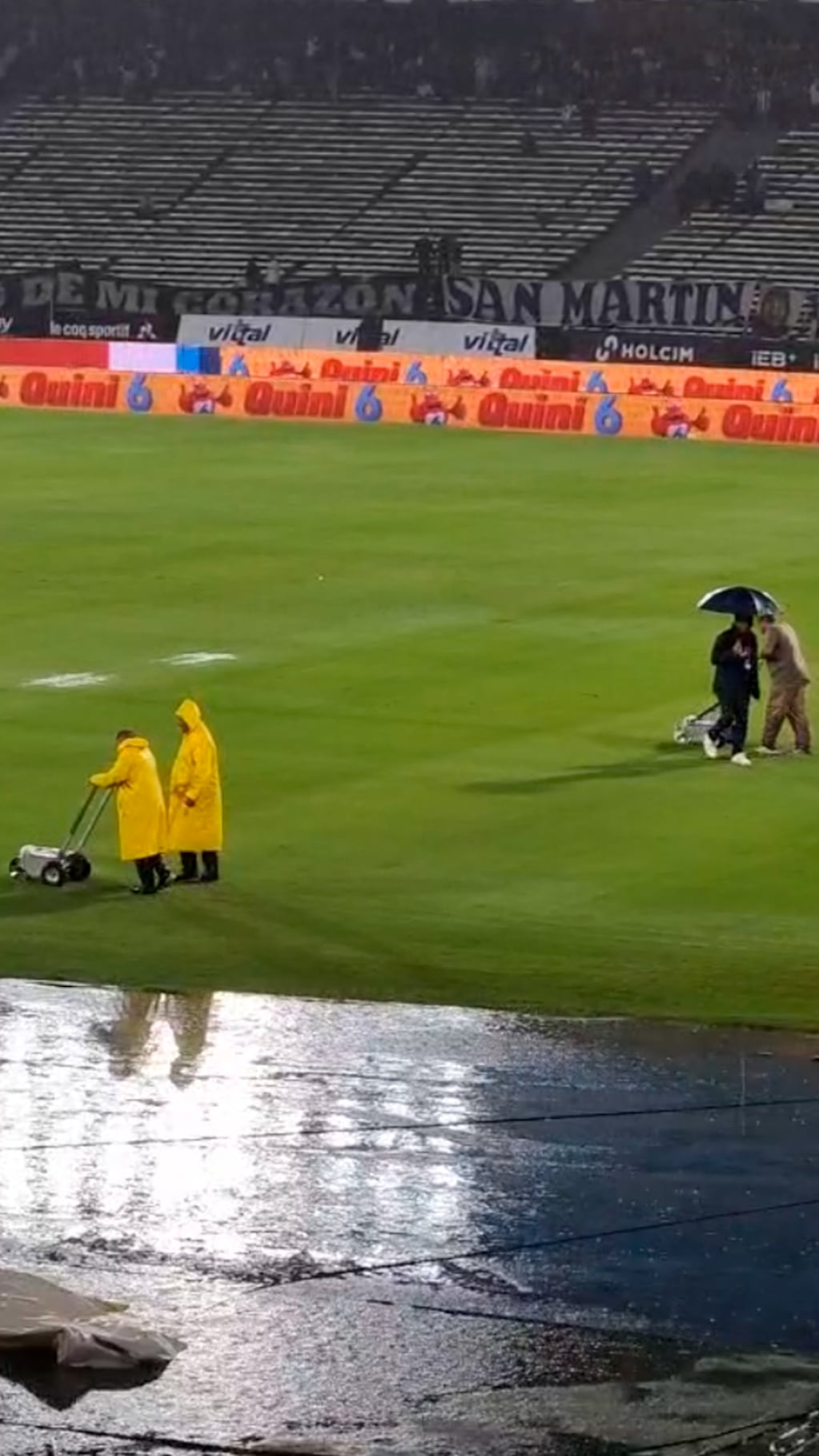 El trabajo de auxiliares sobre el campo de juego del Kempes debido a la lluvia torrencial registrada cuando debía empezar el compromiso por la fecha 15 del Apertura.