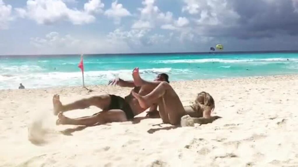 El defensor de Independiente no tuvo piedad con su novia en un picado en la playa, en Cancún. La sensualidad de Carina se hizo viral.