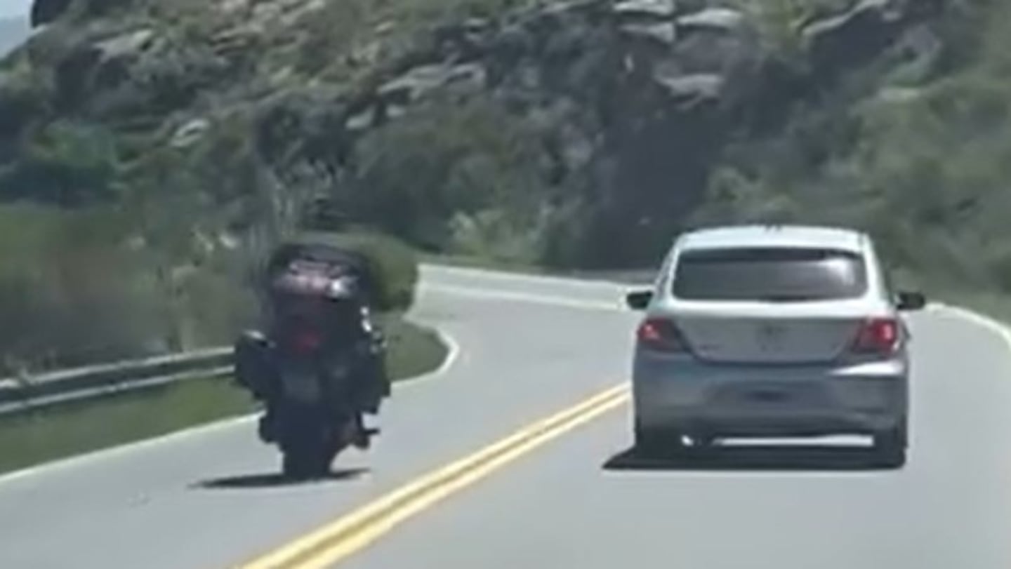 Imprudente sobrepaso de motos en doble línea amarilla en las Altas Cumbres