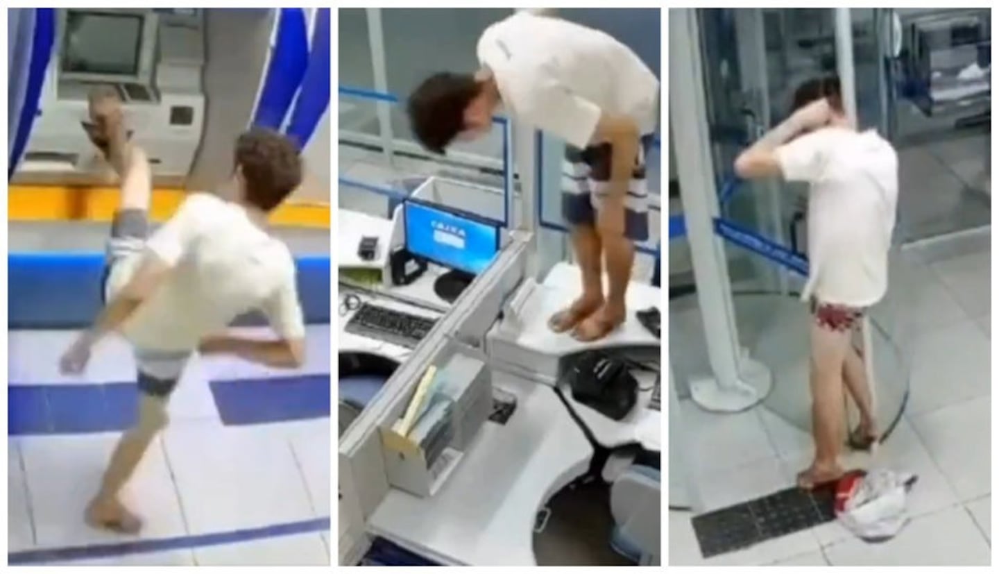La increíble secuencia tuvo lugar en un banco de Brasil. El joven de 20 años fue detenido por la Policía horas después del episodio.