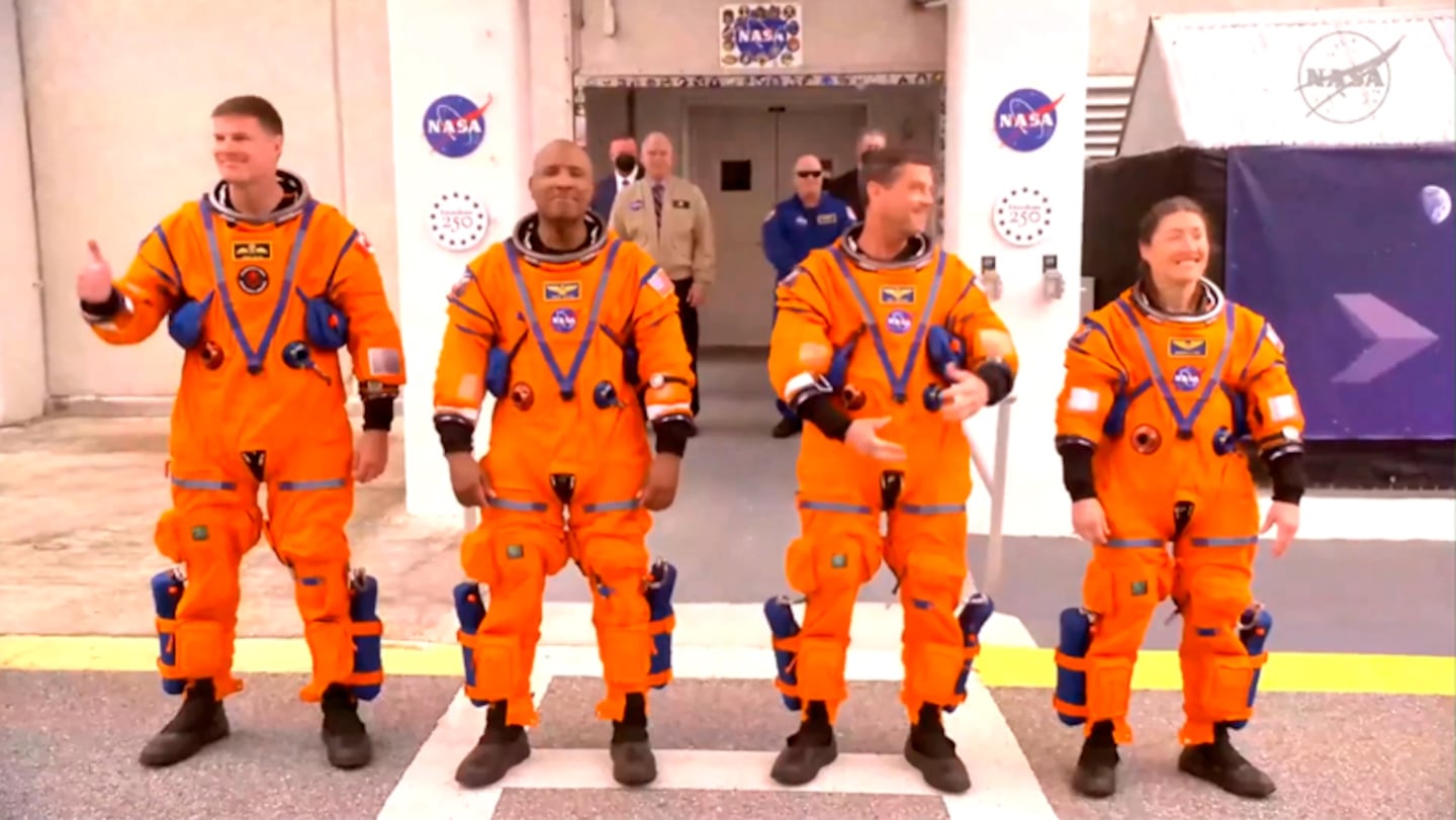 Los cuatro tripulantes salieron del edificio de cuarentena y se dirigieron a una camioneta que los trasladó hasta la plataforma de lanzamiento.