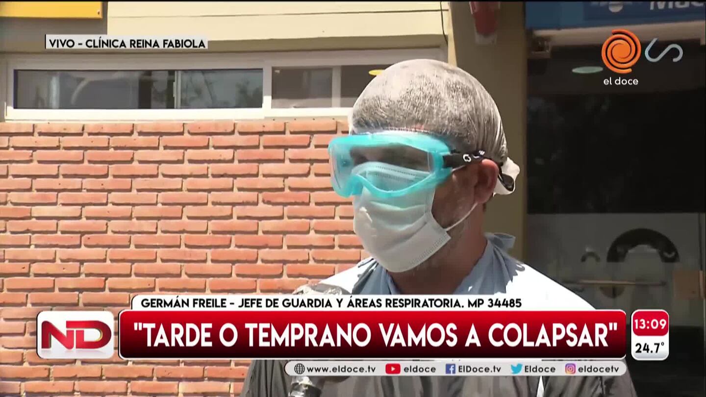 Germán Freile, jefe de guardia y áreas respiratorias de la Clínica Reina Fabiola, indicó a Noticiero Doce que trabajan con una internación al 70/80 por ciento de la capacidad y si el 15 días crece el requerimiento, "no habrá recurso humano ni físico que lo permita".