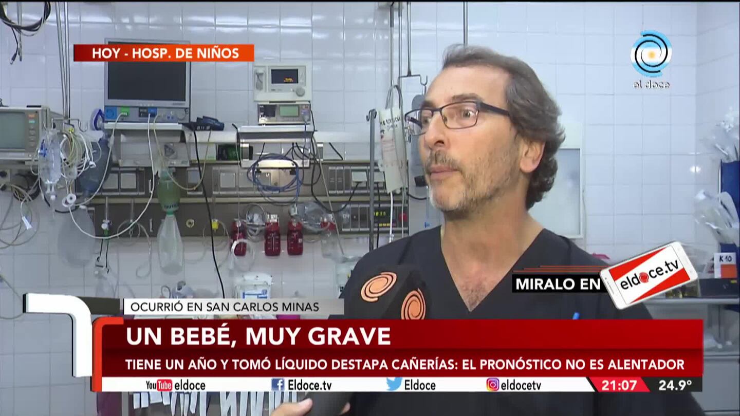 Tiene un año y lo ingirió porque estaba en una botella. Ocurrió en su casa de San Carlos Minas. Según los médicos, el pronóstico no es nada alentador. Tuvieron que extirparle parte del esófago, estómago e intestino.